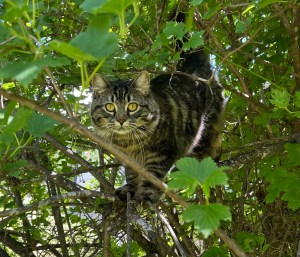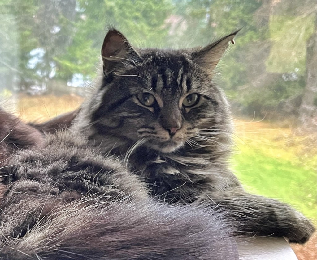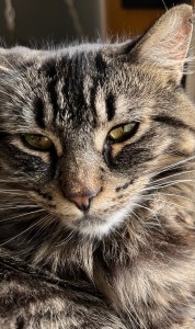 - Tabby (brown with black markings), medium-length fur, fairly small, nick in her left ear, microchipped